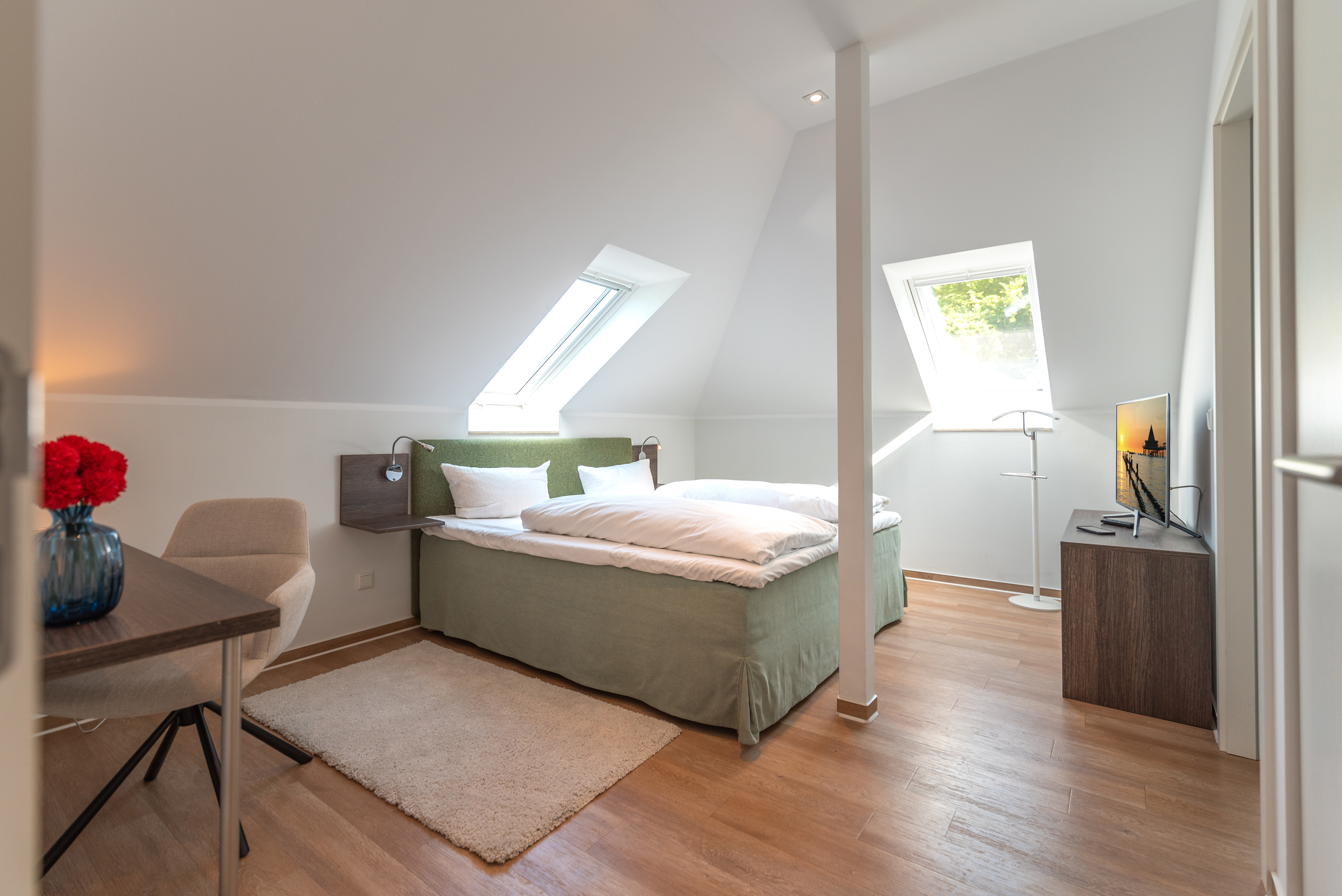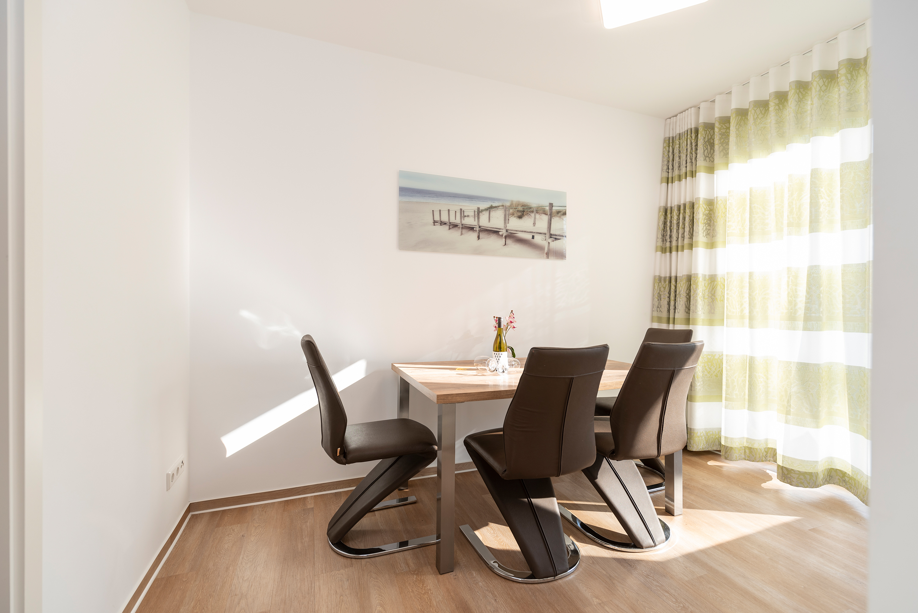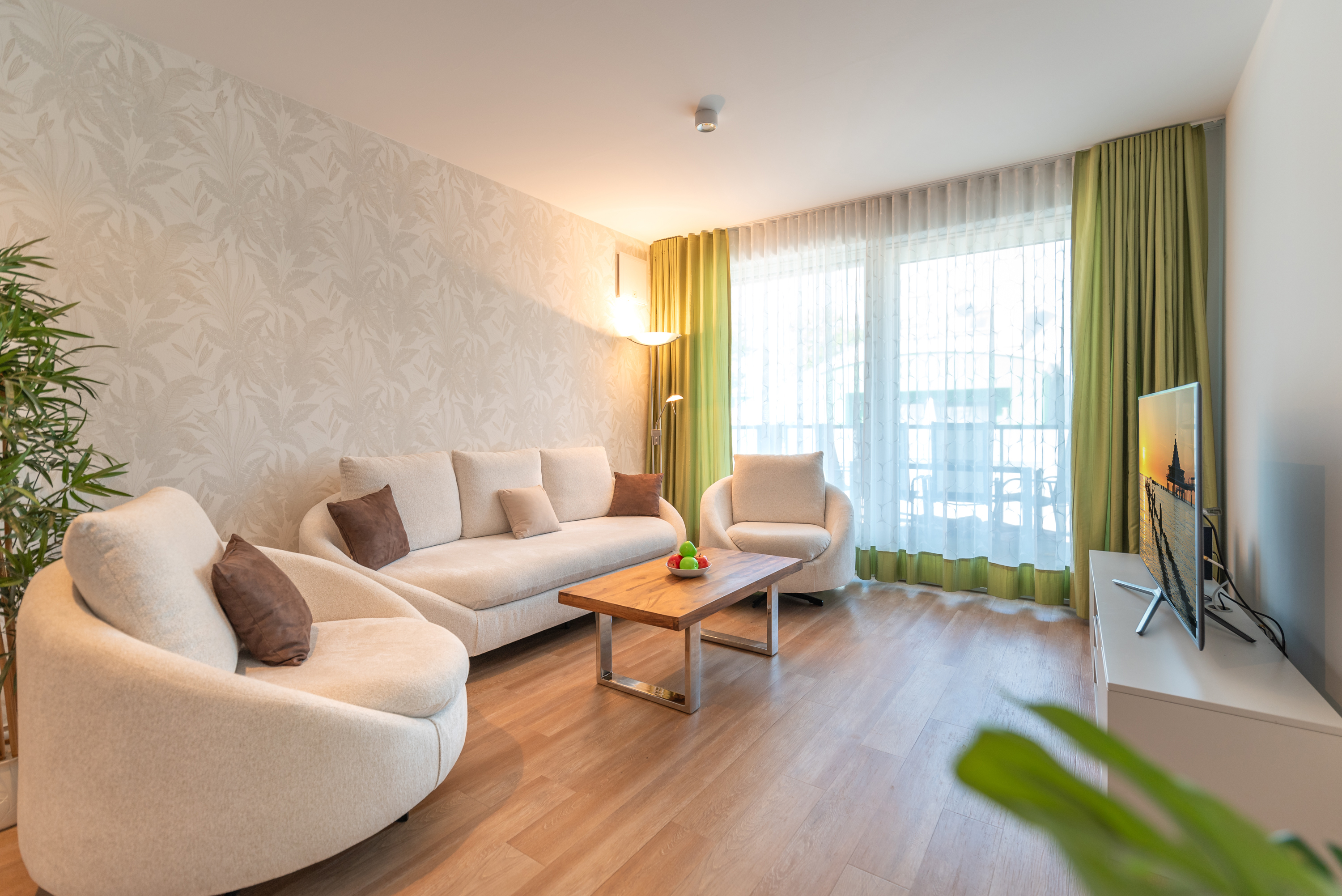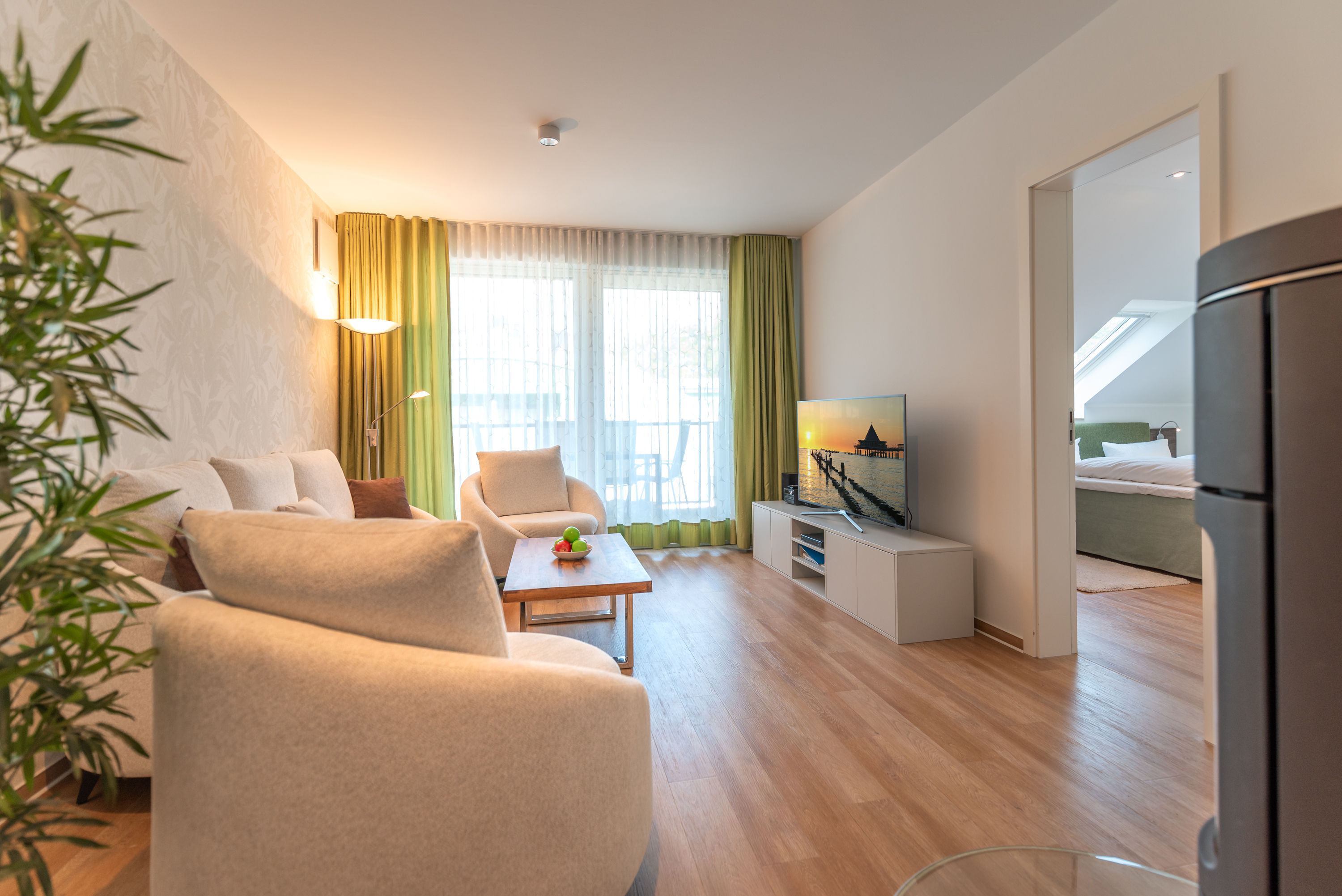 Das 3-Raum-Appartement Nr. 08 in der Villa Evi bietet alles, was man sich für einen erholsamen Urlaub an der Ostsee wünscht. Die Villa gehört zu den modernen „Residenzen am Kulm“, die 2015 auf einer malerischen Anhöhe im Seebad Heringsdorf erbaut wurden. Von hier aus genießen Sie nicht nur eine ruhige und exklusive Lage am Kavaliersweg, sondern auch einen wunderbaren Ausblick – und sind trotzdem in wenigen Minuten am feinsandigen Strand, nur etwa 500 Meter entfernt. Restaurants, kleine Läden und Cafés in Heringsdorf sowie in den Nachbarorten Bansin und Ahlbeck sind bequem erreichbar und machen den Aufenthalt angenehm unkompliziert. Das Appartement ist 80 Quadratmeter groß und bietet Platz für bis zu vier Personen und ein Kleinkind. Der großzügige Wohnbereich lädt mit einer gemütlichen Sitzgruppe, Kamin und 55-Zoll-Flat-TV zum Entspannen ein. Von hier aus betreten Sie auch einen der beiden Balkone, die sich perfekt für ein Frühstück in der Morgensonne oder einen ruhigen Abend bei frischer Seeluft eignen. Die offene Küche ist komplett ausgestattet und schließt direkt an den Essbereich für vier Personen an. Auch von hier führt eine Tür auf den zweiten Balkon. Zwei Schlafzimmer sorgen für erholsame Nächte: Das Hauptschlafzimmer verfügt über ein Boxspringbett (1,80 m x 2,00 m) und direkten Zugang zum eleganten Badezimmer. Das zweite Schlafzimmer ist mit zwei einzelnen Boxspringbetten (1,00 m x 2,00 m) eingerichtet. Beide Räume sind mit einem eigenen Flat-TV ausgestattet. Das Badezimmer selbst bietet mit Dusche, Badewanne, Sauna, Waschtisch und WC echten Komfort, dazu gibt es ein separates Gäste-WC. Zwei PKW-Stellplätze, kostenfreies WLAN und ein Fahrradraum im Keller stehen ebenfalls zur Verfügung. Auf Wunsch können Kinderreisebett und Hochstuhl bereitgestellt werden (gegen Aufpreis). Handtücher und Bettwäsche liegen bereits bei Ihrer Ankunft bereit, damit der Urlaub sofort entspannt beginnen kann. So steht einem unbeschwerten Aufenthalt in Heringsdorf nichts im Weg – in einem Appartement, das Komfort, Stil und Strandnähe harmonisch verbindet.