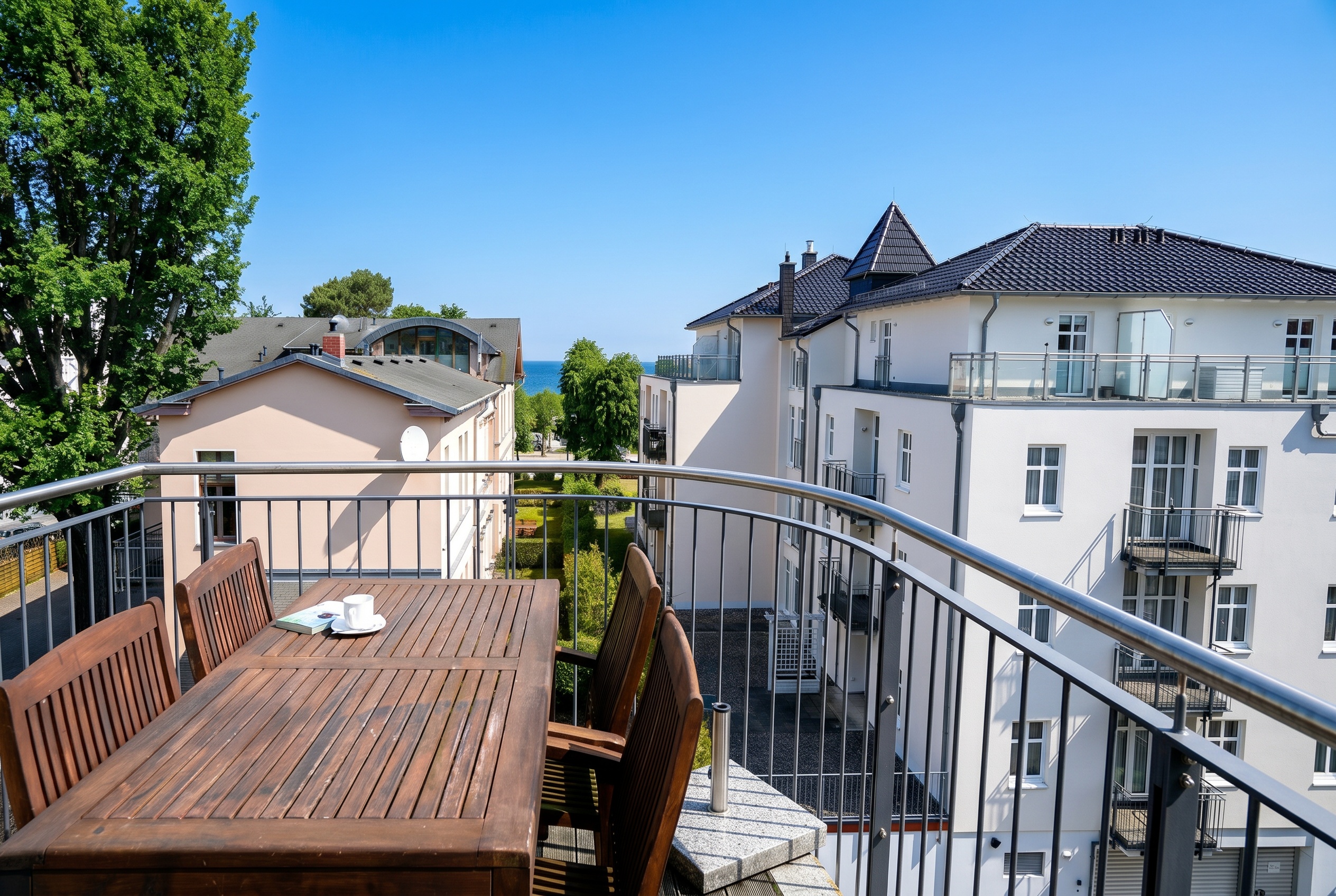 Diese großzügige 4-Raum-Ferienwohnung im 2. Obergeschoss bietet auf rund 97 m² viel Platz für bis zu sechs Personen und ist ideal für einen entspannten Urlaub am Meer. Herzstück der Wohnung ist der offene Wohn- und Essbereich mit integrierter Küchenzeile. Die Küche ist komplett ausgestattet und verfügt unter anderem über Backofen, Mikrowelle, Geschirrspüler und ein Gefrierfach, sodass Sie sich auch im Urlaub bequem selbst versorgen können. Am großen Esstisch finden bis zu sechs Personen Platz. Die gemütliche Sitzgruppe mit Kaminofen und Flat-TV lädt zu entspannten Abenden ein. Drei separate Schlafzimmer sind jeweils mit komfortablen Boxspringdoppelbetten (1,80 m x 2,00 m) und Kleiderschrank eingerichtet. Zwei der Schlafzimmer verfügen zusätzlich über einen eigenen Flat-TV. Besonders komfortabel sind die drei modernen Badezimmer mit Dusche, Waschtisch und WC. Eines der Bäder bietet zusätzlich eine Badewanne. Zwei der Bäder sind direkt an ein Schlafzimmer angeschlossen (ensuite) und bieten einen schönen Blick zum Meer. Für sonnige Stunden im Freien stehen Ihnen zwei Balkone mit Bestuhlung zur Verfügung. Einer ist nach Osten ausgerichtet und eignet sich perfekt für ein Frühstück in der Morgensonne, der andere zeigt nach Westen und lädt dazu ein, den Tag bei Abendsonne ausklingen zu lassen. Ein PKW-Stellplatz (Nr. 10) in der teilüberdachten Tiefgarage gehört zur Wohnung. Außerdem steht eine gemeinschaftliche Fahrradabstellfläche zur Verfügung. Münzwaschmaschine- und Wäschetrockner können im Untergeschoss gemeinschaftlich genutzt werden.